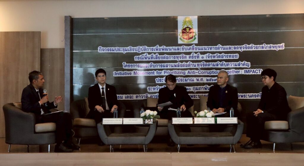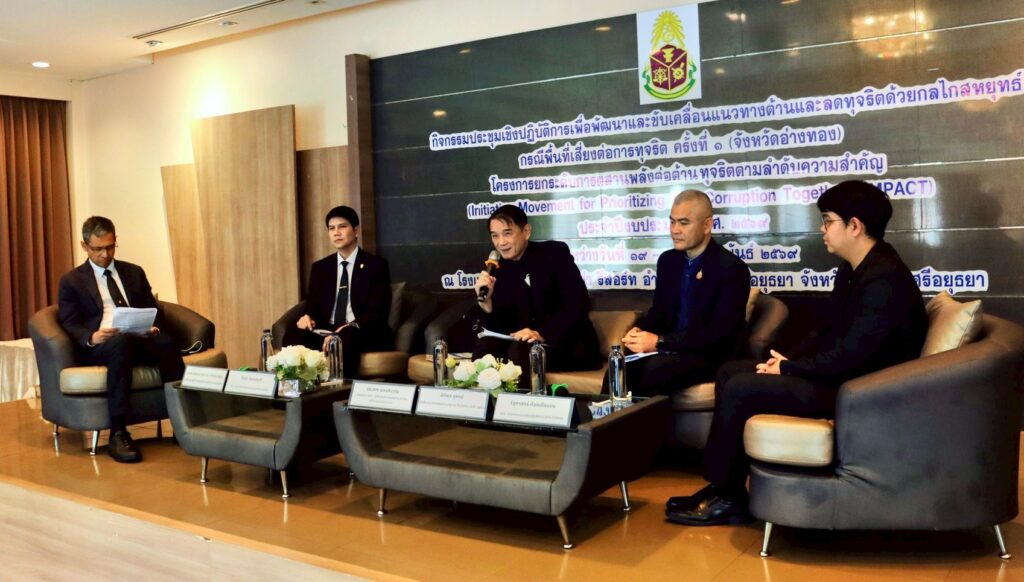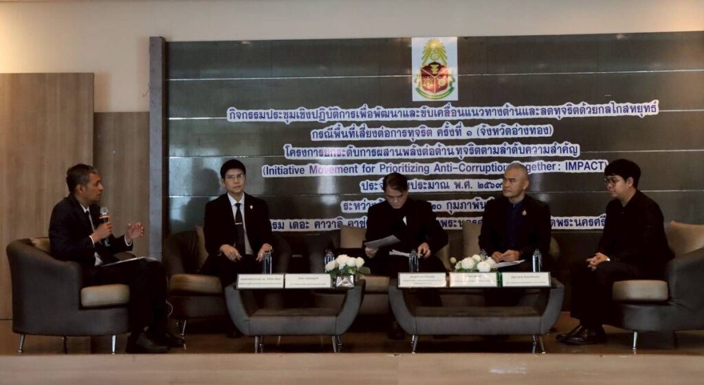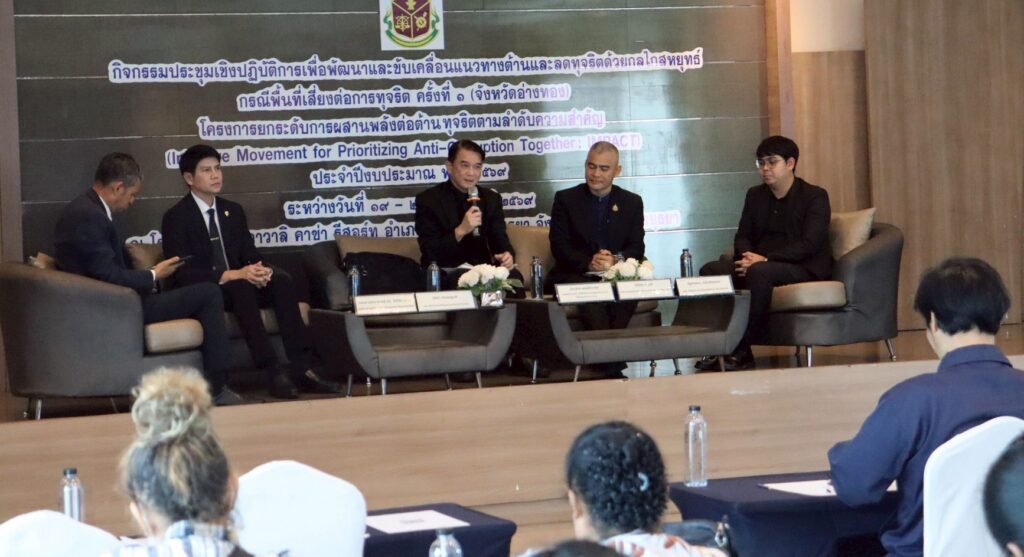 วันพฤหัสบดีที่ 19 กุมภาพันธ์ 2569 เวลา 13.00 น. นายอิสรา ครองญาติ ผู้อำนวยการสำนักตรวจเงินแผ่นดินจังหวัดอ่างทอง ได้รับเชิญเข้าร่วมกิจกรรมและเป็นวิทยากรร่วมอภิปรายในหัวข้อ ”การส่งเสริมและสนับสนุนให้ประชาชน และหน่วยงานของรัฐมีส่วนร่วมในการป้องกันและปราบปรามการทุจริตเพื่อสร้างแนวทางต้านและลดการทุจริตด้วย กลไกสหยุทธ์ ประเด็นความเสี่ยงต่อการทุจริตด้านทรัพยากรธรรมชาติและสิ่งแวดล้อม”